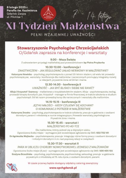 Serdecznie zapraszamy małżeństwa do udziału w wydarzeniu, związanym z Międzynarodowym Tygodniem Małżeństwa. W najbliższą sobotę, 8 lutego u naszych sąsiadów na Zaspie w parafii pw. św. Kazimierza zaplanowano Eucharystię z odnowieniem przysięgi małżeńskiej, a także trzy konferencje i dwa warsztaty.