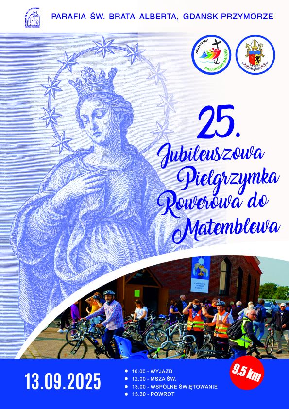 Serdecznie zapraszamy naszych parafian do udziału w XXV Jubileuszowej Pielgrzymce Rowerowej do Matemblewa. Wyruszymy w najbliższą sobotę 13 września. Do przejechania jest około 10 km. Nie przewidujemy żadnych ograniczeń wiekowych. Osoby, które nie ukończyły 18 roku życia mogą wyruszyć tylko pod opieką osoby pełnoletniej. Zbiórka przed kościołem o godz. 10.00. Wyjazd o godz. 10.15. Msza św. w Matemblewie ok. godz. 12.00. Przewidywany powrót na Przymorze o 15.30. Osoby, które chciałyby udać się na pielgrzymkę do Matemblewa autokarem i tam uczestniczyć we wspólnej modlitwie mogą zapisać się w zakrystii. Wyjazd autokaru również o godz. 10.15. Zachęcamy także chętnych do przyjazdu do Matemblewa własnymi środkami transportu. Niech to będzie nasze wspólne rozpoczęcie nowego roku duszpasterskiego w Sanktuarium MB Brzemiennej.