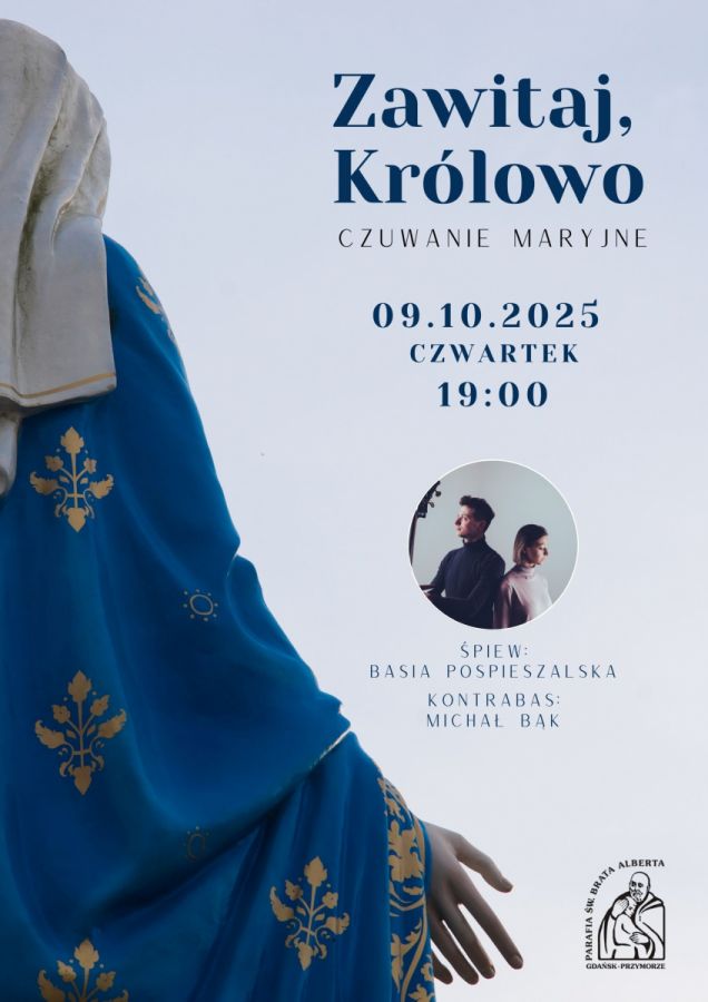 W czwartek, 9 października, zapraszamy na duchowo-muzyczną ucztę, czuwanie pt. „Zawitaj, Królowo”. O godz. 19:00, podczas adoracji Najświętszego Sakramentu, usłyszymy tradycyjne pieśni maryjne w wykonaniu duetu: Basi Pospieszalskiej (śpiew) i Michała Bąka (kontrabas).