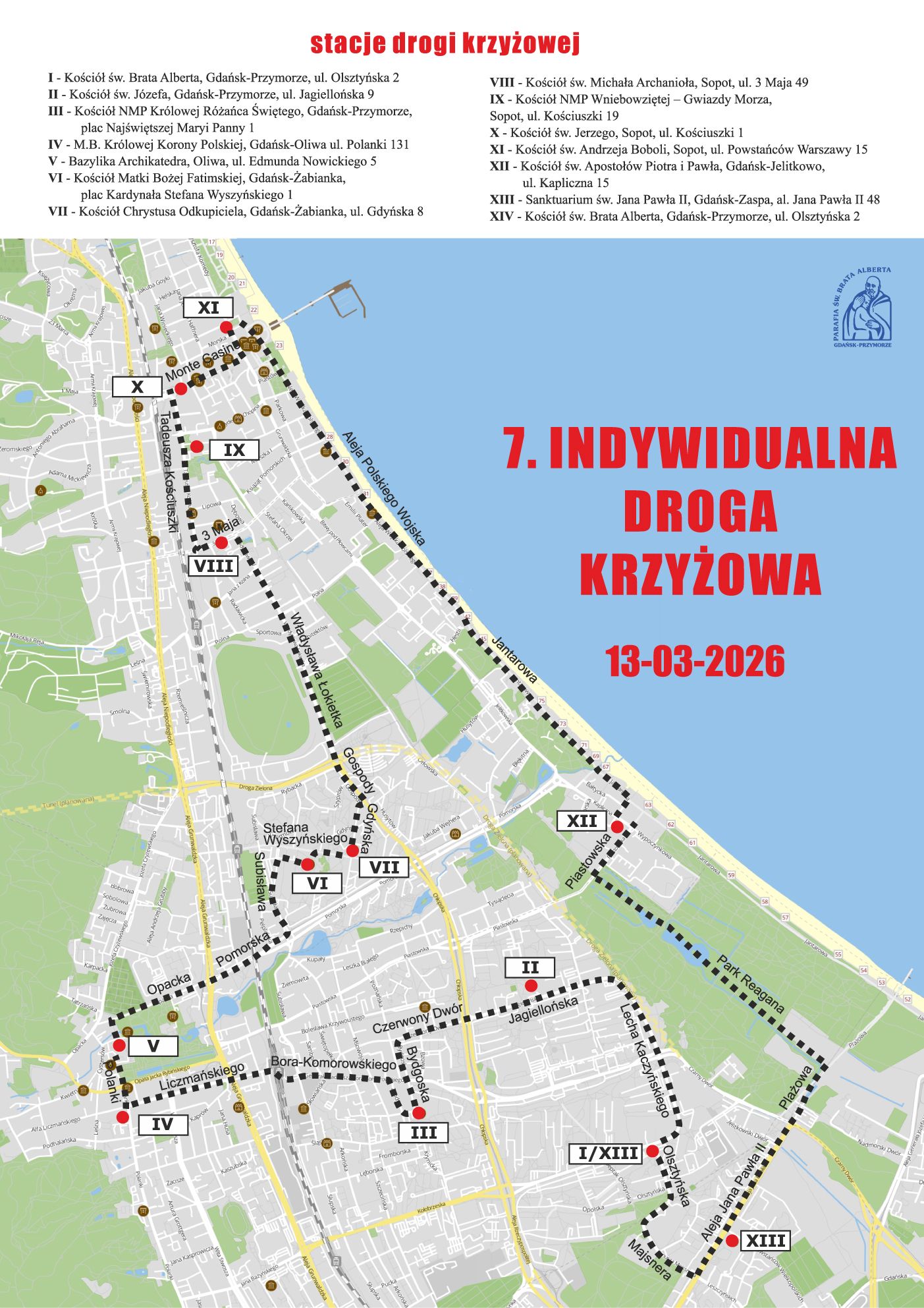 Trasa liczy ok. 20 km. Poszczególne stacje stanowią kościoły znajdujące się na Przymorzu, Żabiance, Oliwie, w Sopocie i na Zaspie. Podczas drogi, pokonywanej własnym tempem w milczeniu, warto odmawiać Różaniec Święty, Koronkę do Bożego Miłosierdzia, słuchać pieśni pasyjnych.
