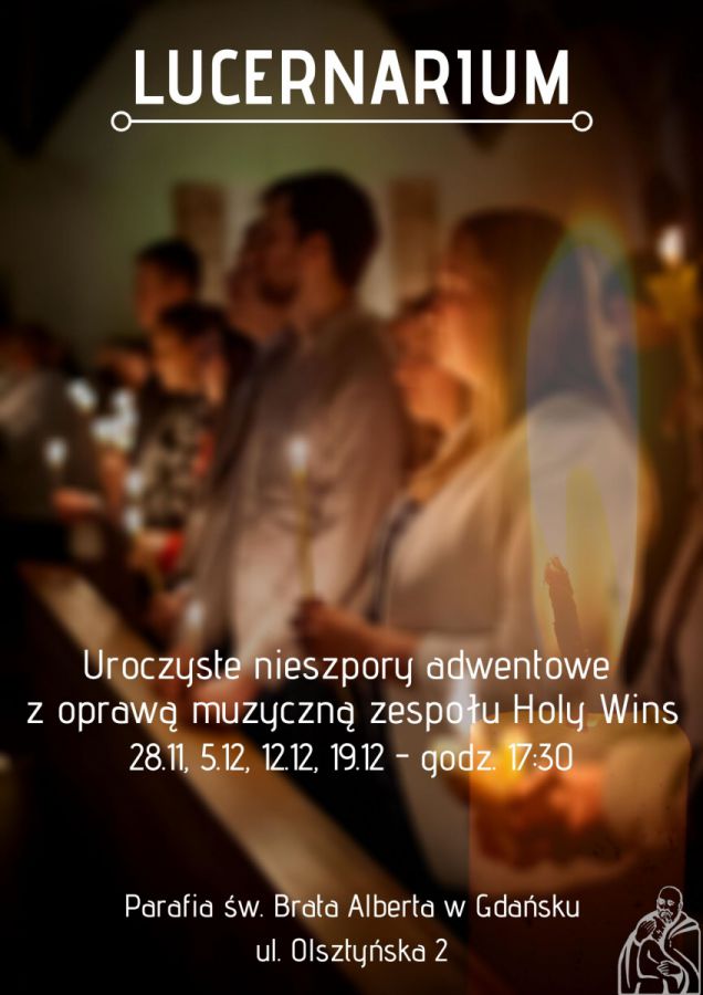 W tym roku chcemy Was zaprosić do wyjątkowego przeżywania lucernariów, które od strony muzycznej przygotowuje zespół Holy wins. Sprzyjający modlitwie nastrój, piękno śpiewów, a przede wszystkim głęboka treść Słowa Bożego, to godna propozycja mogąca pomóc nam jeszcze lepiej wejść w czas oczekiwania na Jezusa Chrystusa - „Światłości Prawdziwej, która oświeca każdego człowieka, gdy na świat przychodzi” (por. J 1,9).