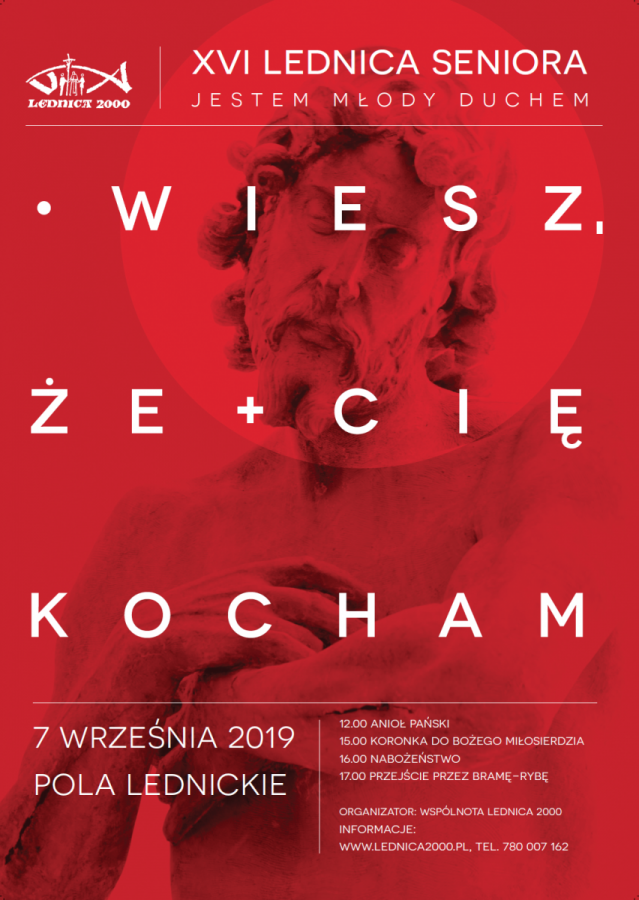 7 września 2019 roku na Polach Lednickich, u źródeł chrzcielnych Polski, odbędzie się XVI LEDNICA SENIORA. JESTEM MŁODY DUCHEM! Tegoroczne hasło: „Wiesz, że Cię kocham”.